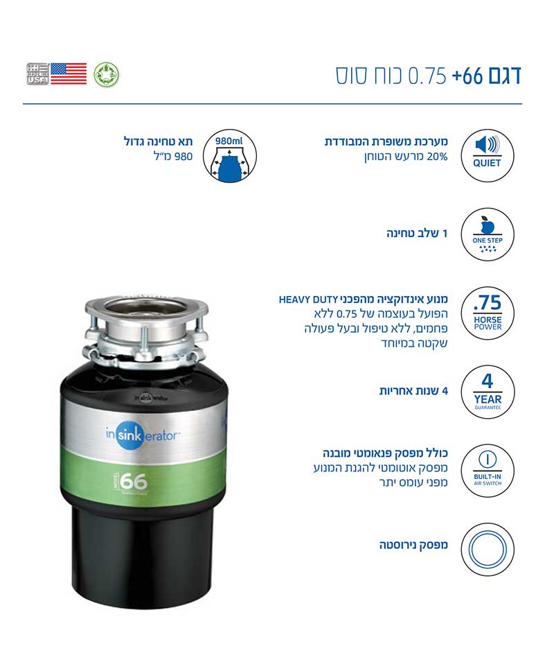 טוחן אשפה ISE דגם 66, מנוע אינדוקציה מהפכני HEAVY DUTY ללא פחמים, ללא טיפול ובעל פעולה שקטה במיוחד, פעולת טחינה דו-כיוונית, להגברת יעילות הטחינה ולפעולה חלקה, כולל מפסק פנאומטי מובנה, מפסק אוטומטי להגנת המנוע מפני עומס יתר, תא טחינה גדול של 980 מ”ל, מערכת טחינה מפלדת אל-חלד, מפתח שרות בלעדי למניעת תקלות, דגם חדש - טכנולוגיית טחינה משופרת.